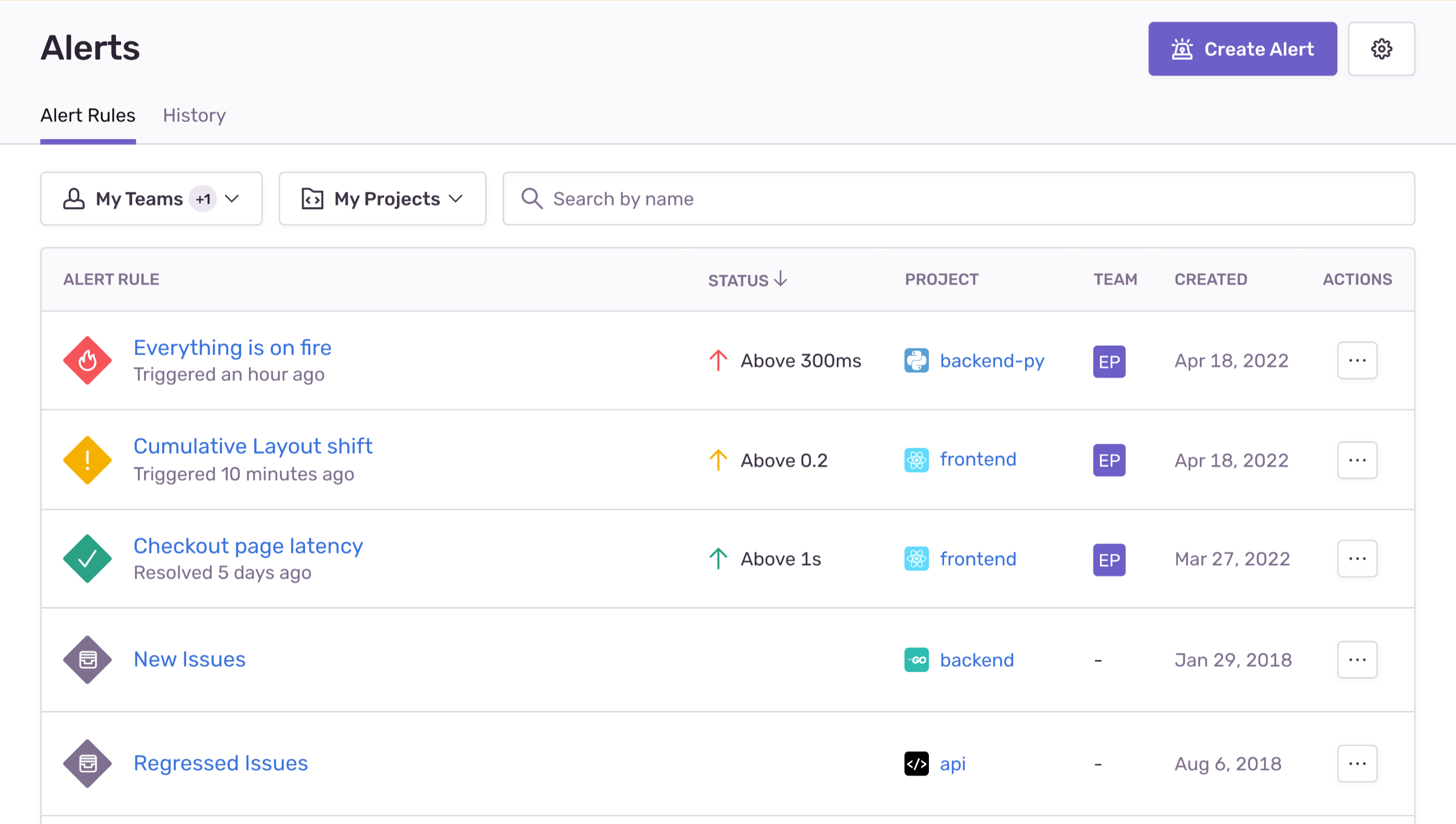 In the “Alert Rules” tab, these alerts are identified by the issues icon, and by default, they are displayed at the bottom of your list of alerts. (If you have several metric alerts, this may push your issue alerts off the first page of the list.)